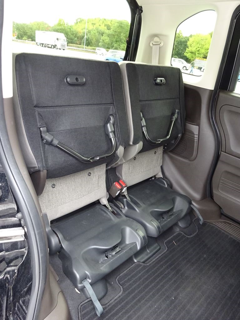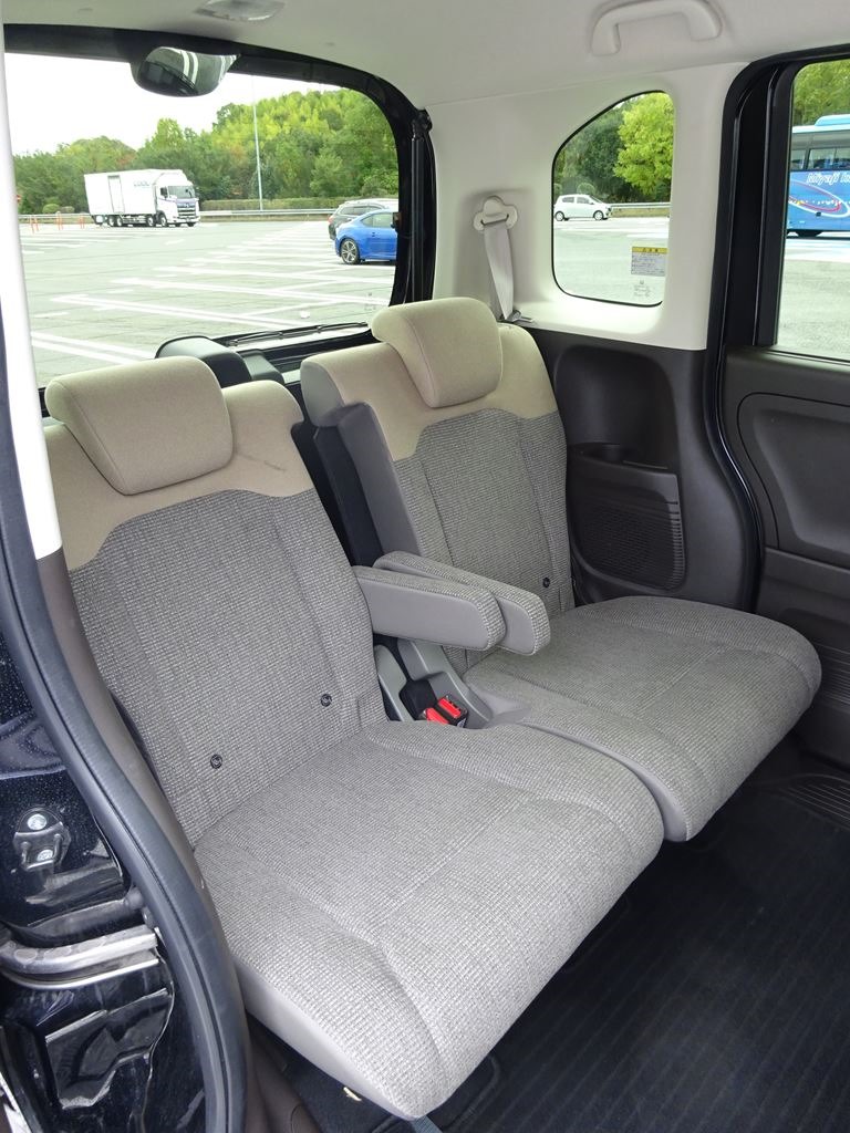 リアシートはこんな感じ。背もたれが他の軽よりも高い。そして、アームレストが付いているのが最高。このクラスではN-BOXにしかついていない装備である。リアシートに座った時の快適さはこの車がピカイチだと思う。