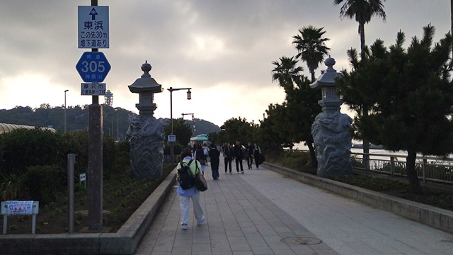 と、橋のたもとに江の島弁天丸のりばというのがあった。弁天丸はここと島の西岸にある岩屋港との間を結ぶ連絡船で、岩屋洞窟へ行くのに近道とある。実際島の中を通って岩屋洞窟の方まで向かうには、島の中央に横たわる山を越えていく必要があるので、結構しんどい道のりなのだが、この船に乗ればそこを回避できるので安楽である。
