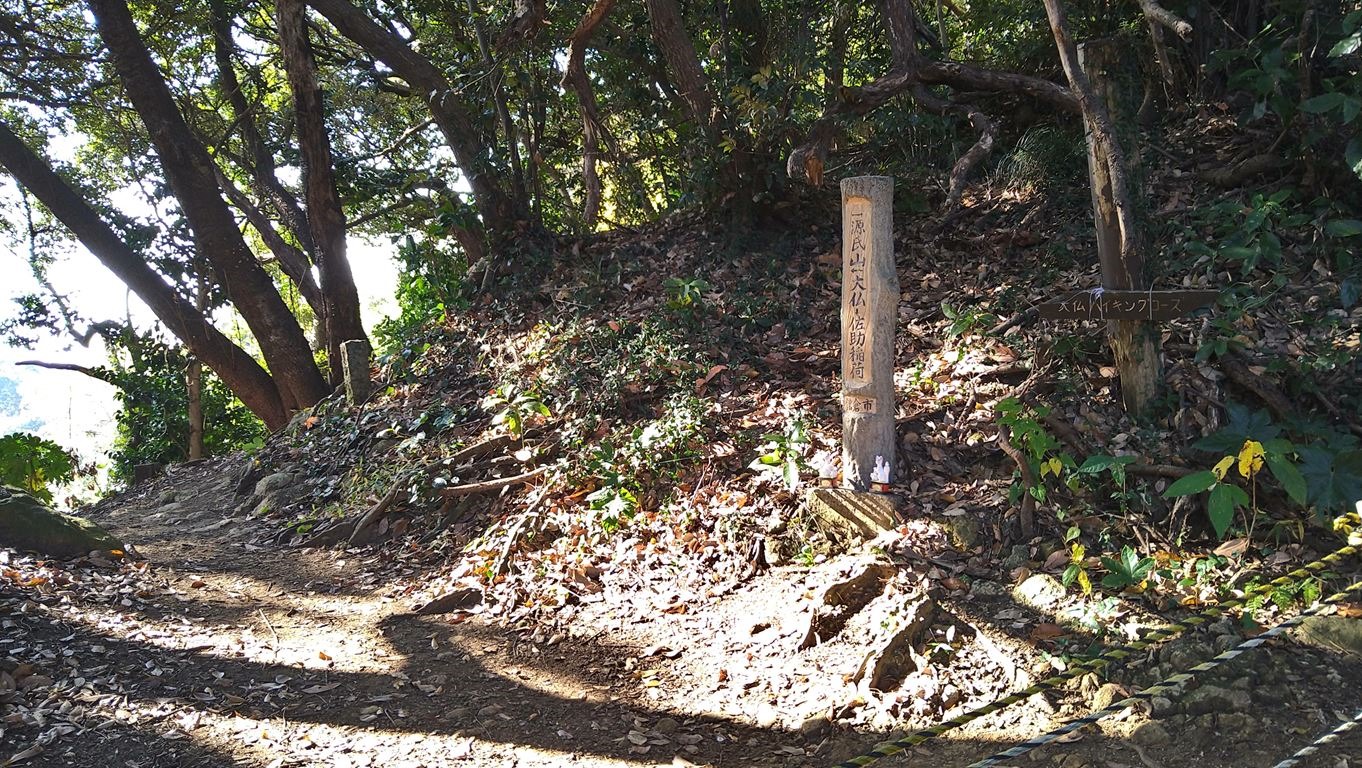 御塚の周囲を見回してみたら、御塚の背後に歩道のようなものが見えた。なるほど、ここから登るのだな。そう思って登り始めたのだが、途中で道が消えてしまい先に進めなかった。
