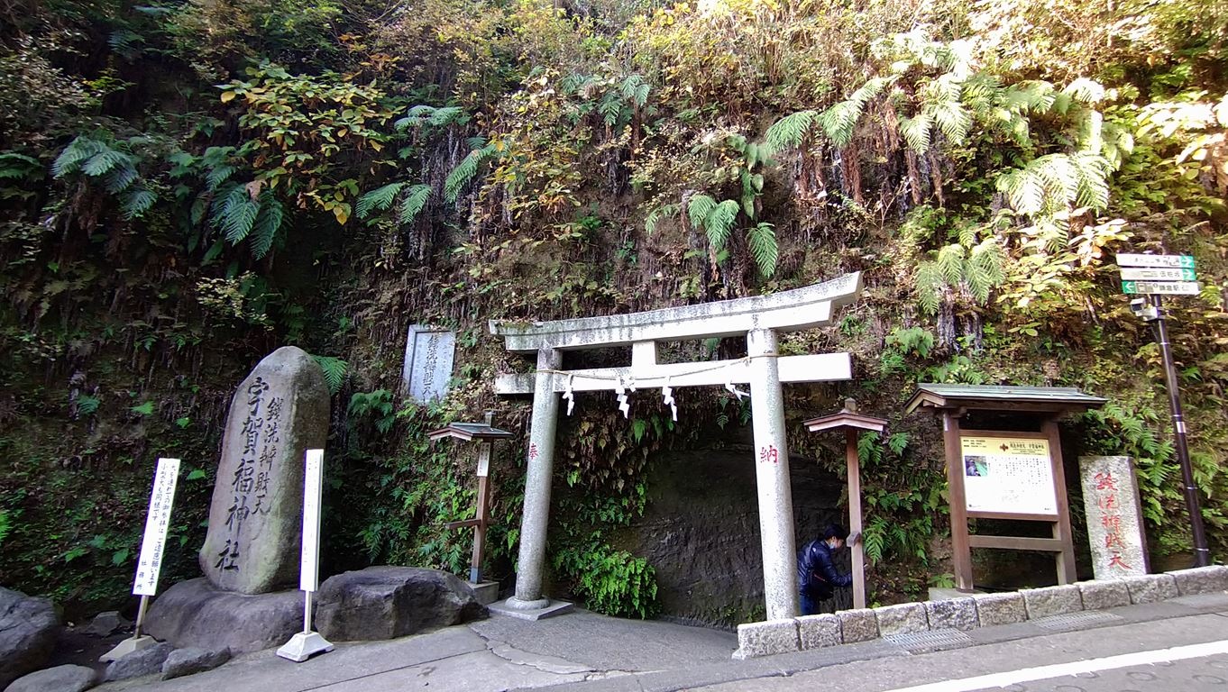 突然道の脇の斜面にへばりつくように建つ鳥居が見えてくる。その背後には洞穴のようなトンネルがある。ここが銭洗弁財天だ。正しくは宇賀福神社という。