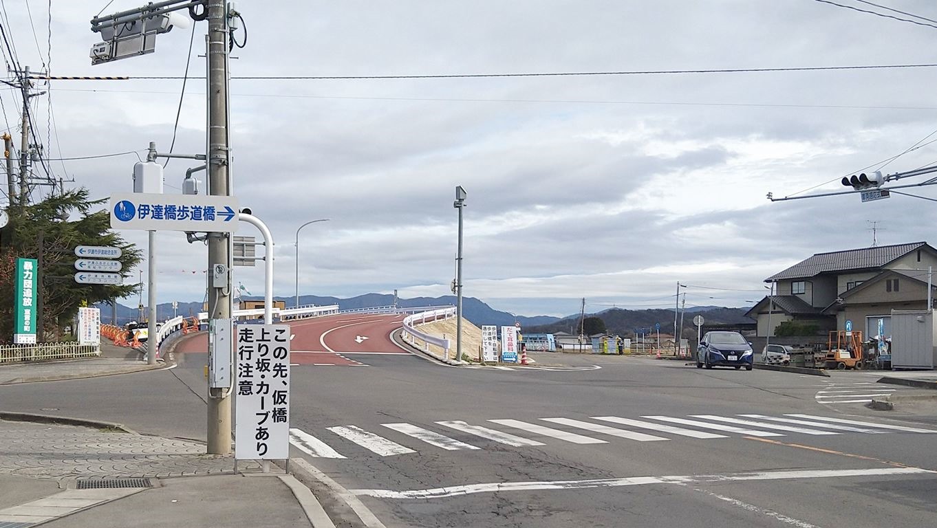 いくら歩行者はほぼいないような道とはいえ、省略するのは違うんじゃないの?なんて思っていたら、伊達橋歩道橋と書かれた看板が出ているのが見えた。その辺りまで来ると右手側に並走している小さな橋のようなものが見えた。なるほど、歩行者用の橋は別にあるのか。
