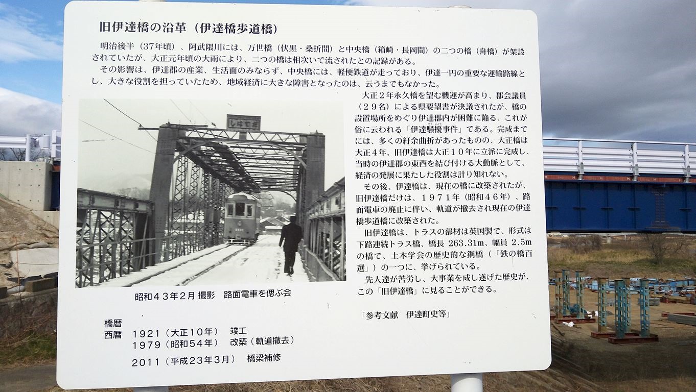 橋の袂に看板が出ていたので何気なく目を向けると、この橋(旧伊達橋)にはかつて福島交通軌道線が通っていたということが書かれていた。しかも写真に橋を渡る人が写っているとおり人道橋も併用している。まぁ、軌道線というのは即ち路面電車なので、人や車が渡っていても変でも何でもないのだが。