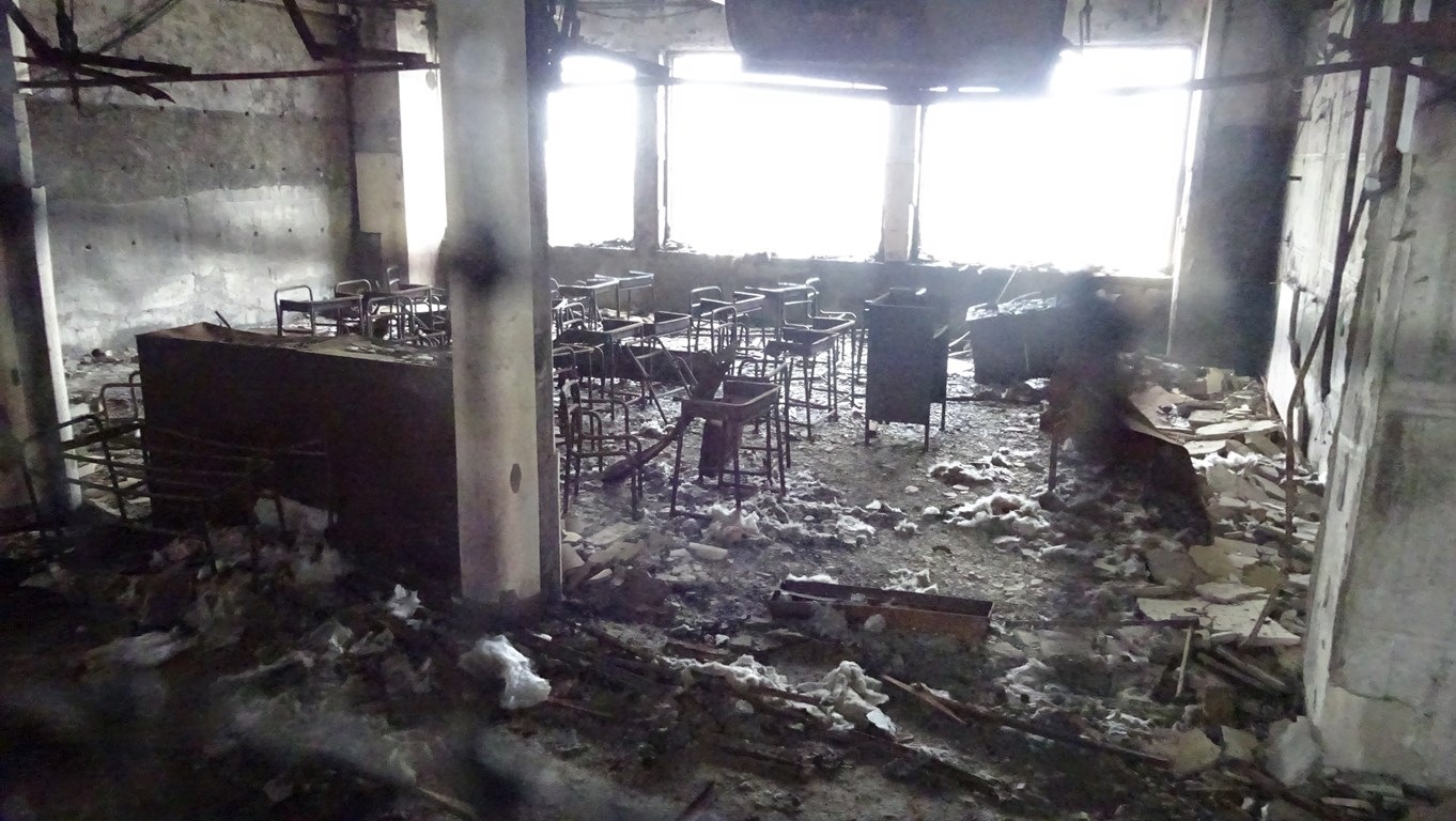 ご覧のとおり、3階建ての校舎のほぼすべての窓ガラスが欠落し、建物は黒くすすけている。