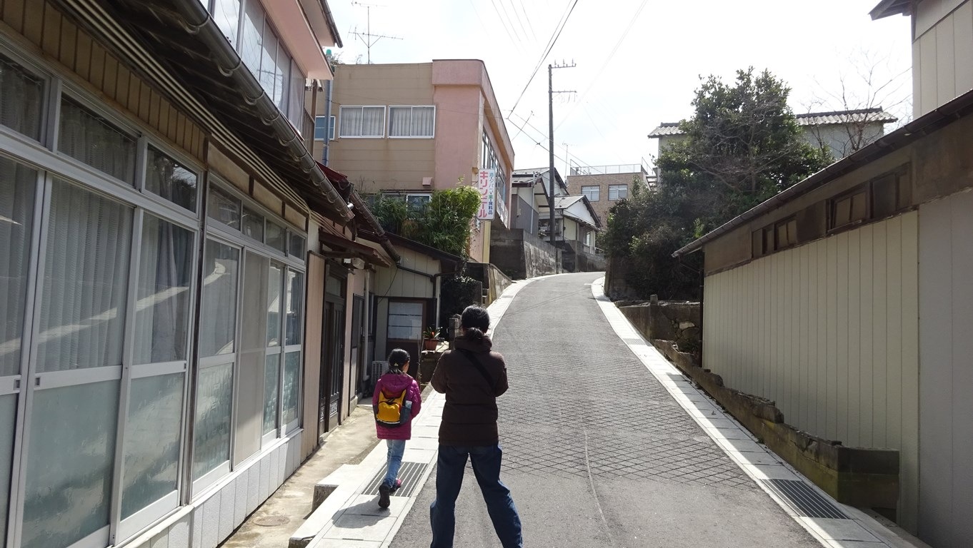 奥の路地から先は上り坂になって島の高台へと繋がっている。その両側に建ち並ぶ家々はどれも年季が入っている。