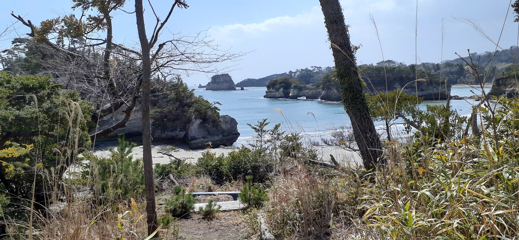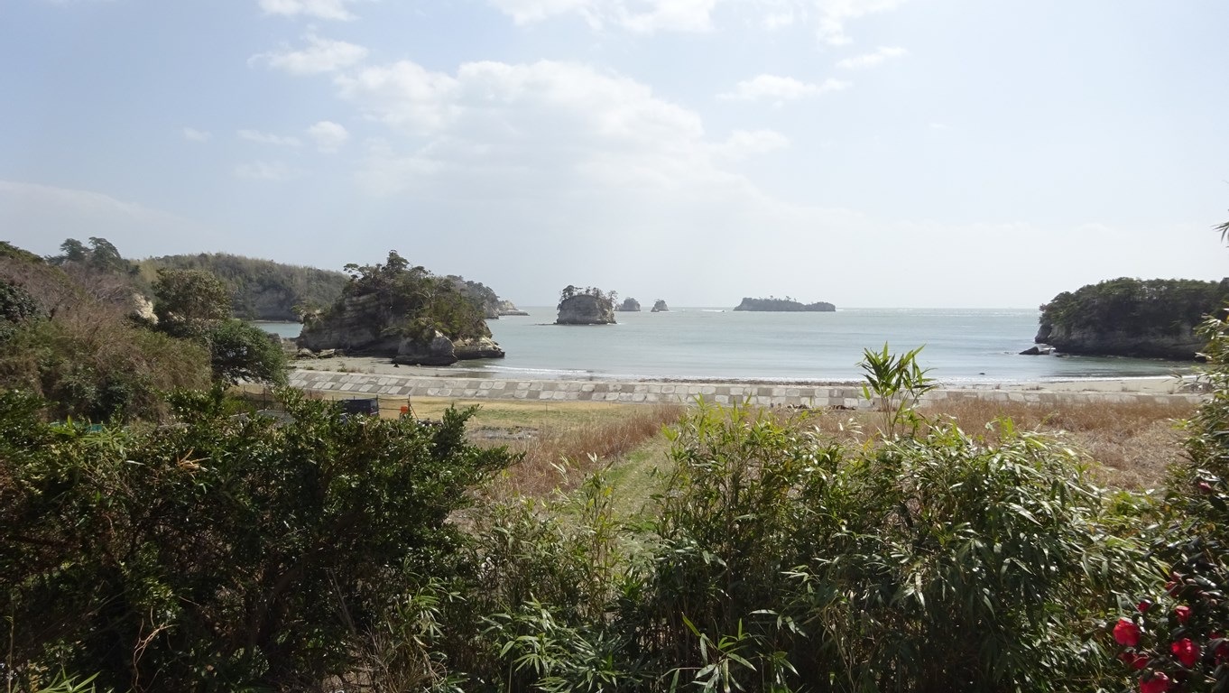更に奥の方に遊歩道が続いていたので進んでいくと、眼前に多島海が現れた。字内浜という場所のようだ。左側に見える島は前島といい、正面奥の小島が焼島、そして右側が陰田島である。陰田島は別名おいらん島とも呼ばれており、かけ田島という伝説があるそうだ。