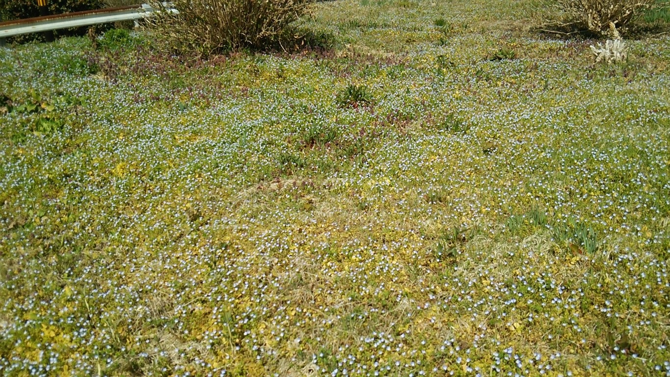 地面にはスイセンの花が所々に植えられ、その周囲にオオイヌノフグリの小さな青い花が一面に咲き誇っていた。そういえばオオイヌノフグリなんて最近見てないなぁ。