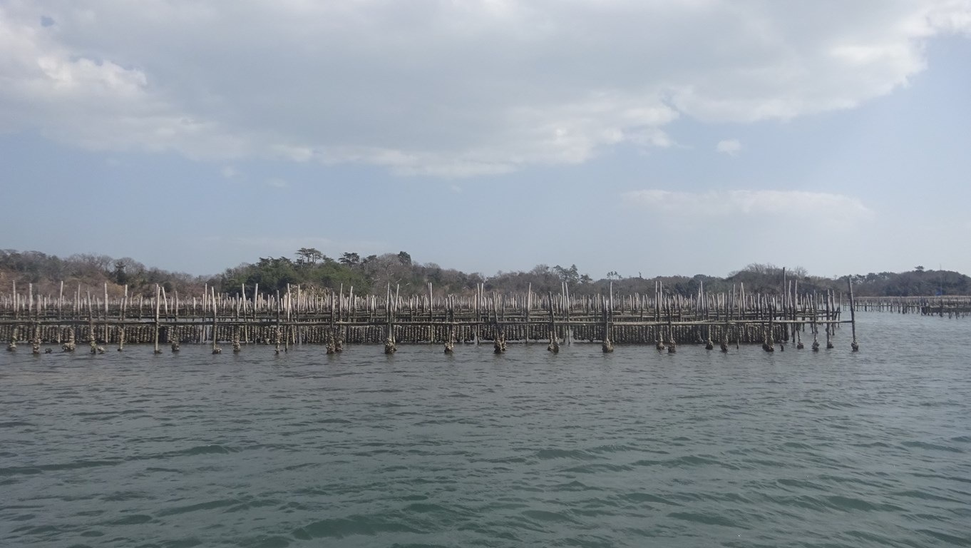 船の通り道の両側は一面養殖棚に埋め尽くされている。丁度潮が引いているせいか海面上に貝殻が見える。やや遠目ではっきりと分からないが、あの形はホタテだろうか。